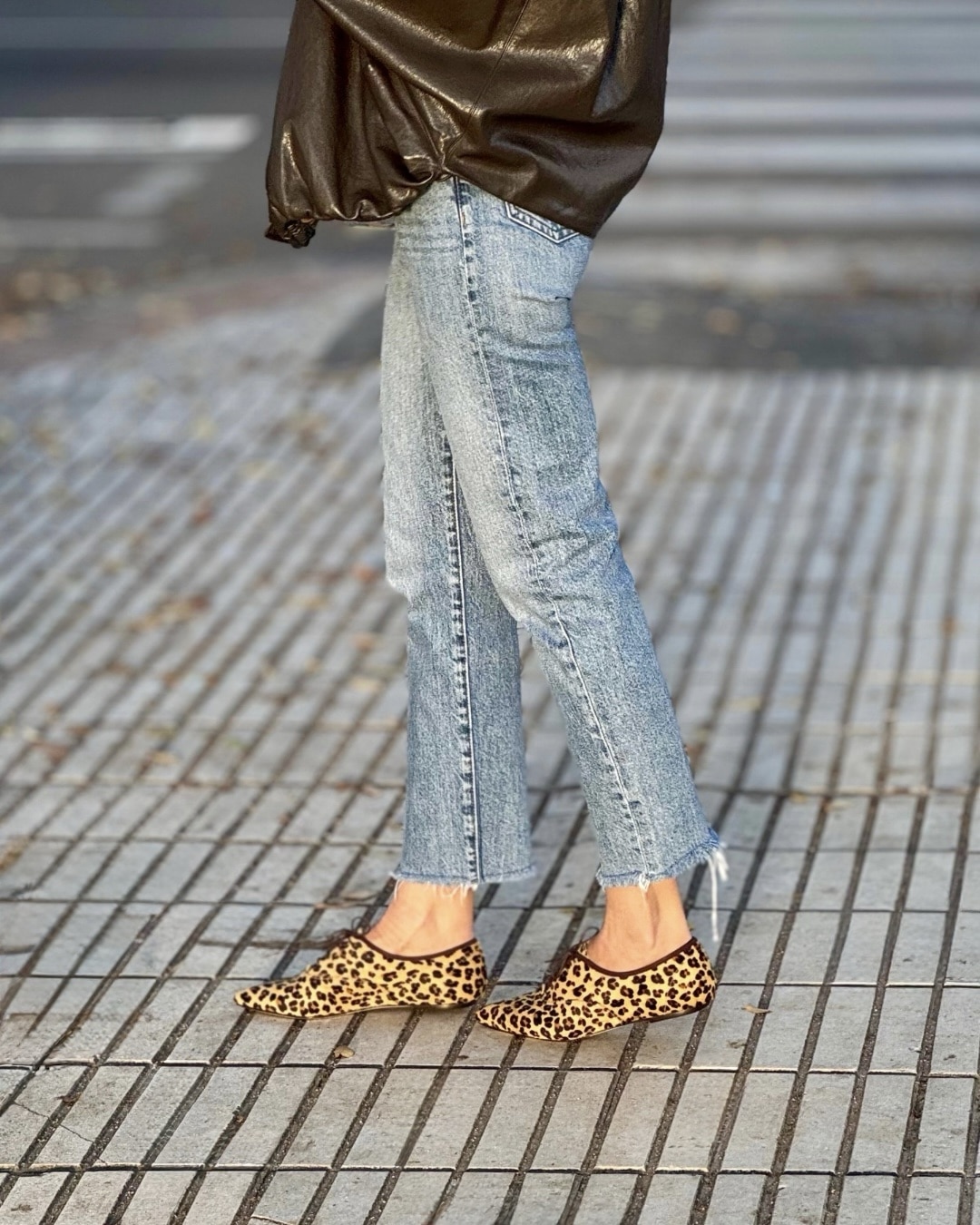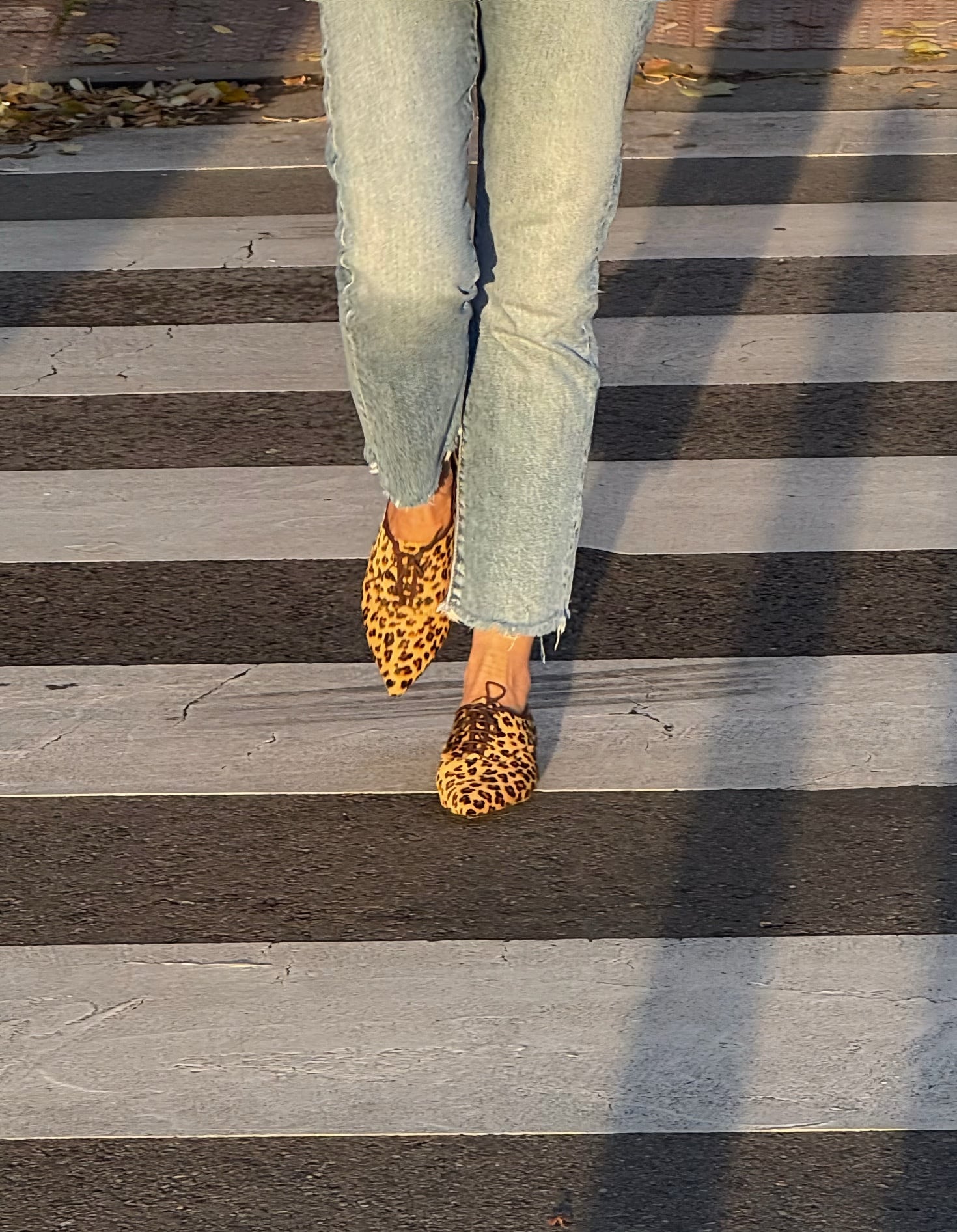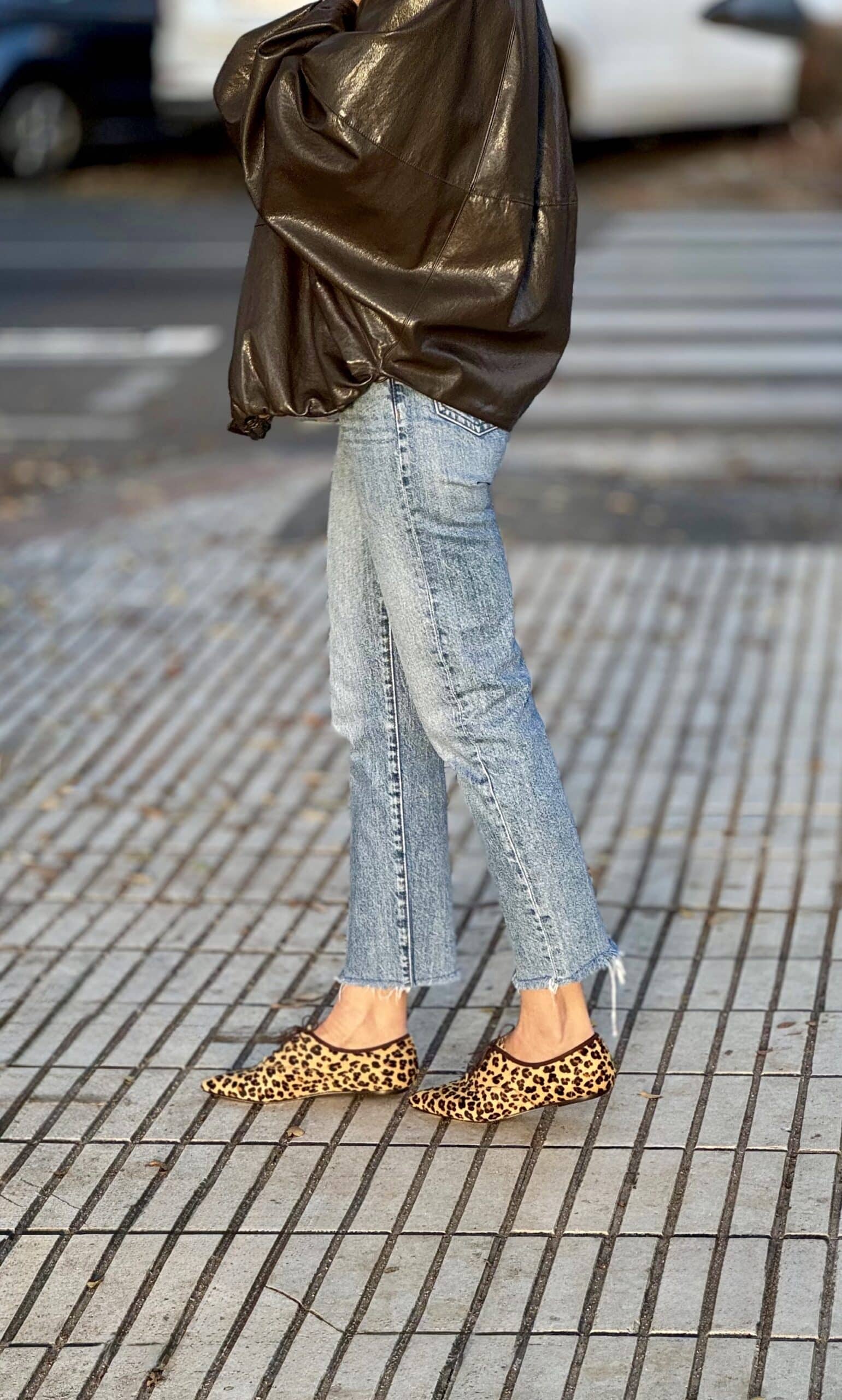 Zapato plano Derby de punta, en piel de pelo con estampado animal print y cierre mediante cordones.